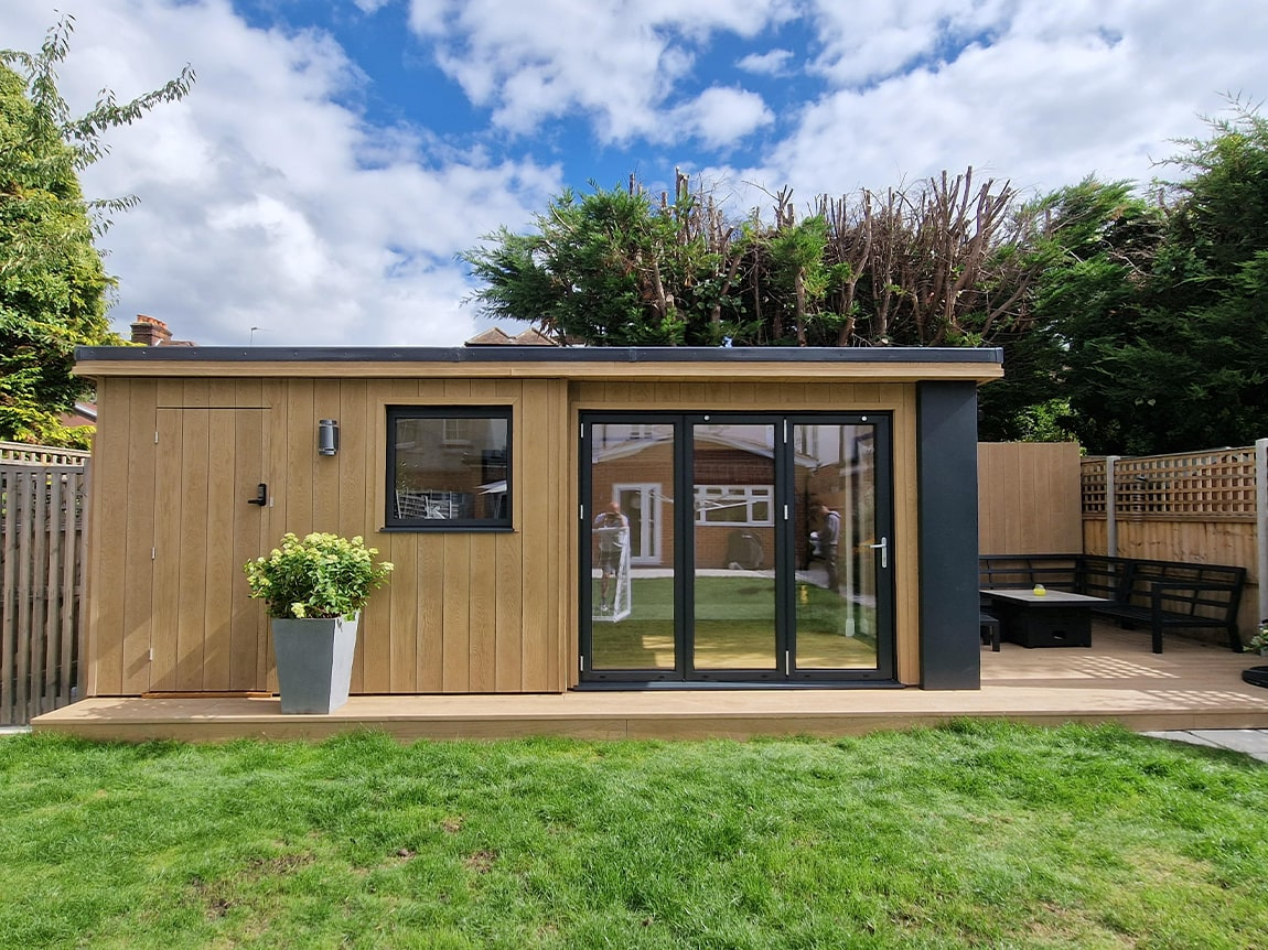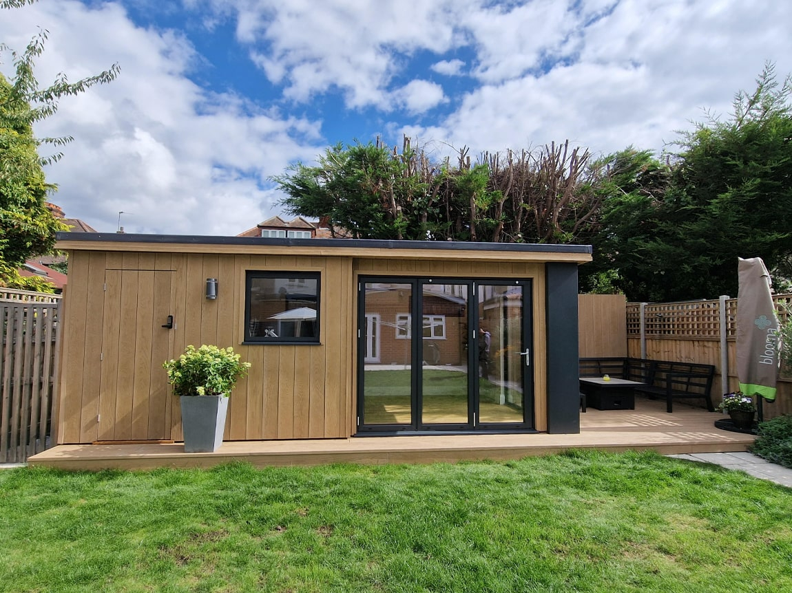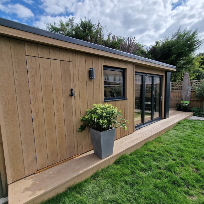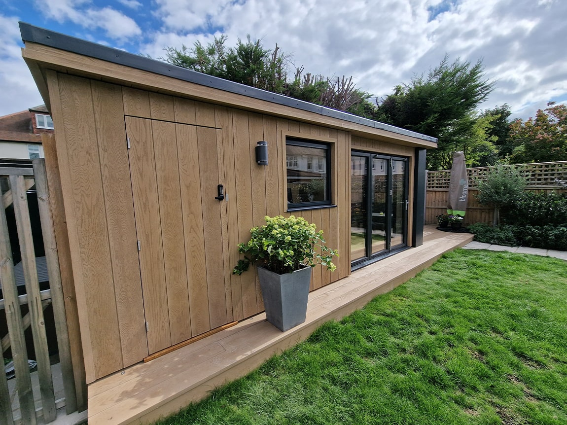 We were tasked with replacing a shed with some storage, an office space and an outdoor seating area. Utilising dead space at the end of the garden.